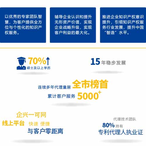 “企興知識產權”團隊擁有資深專利代理人、商標代理人、版權代理人、高級咨詢師、專業律師等專家,擁有多位資深知識產權顧問組成的專業團隊;業務經驗覆蓋國知局七大技術領域(光電、材料、機械、電學、通信、醫藥、化學)。